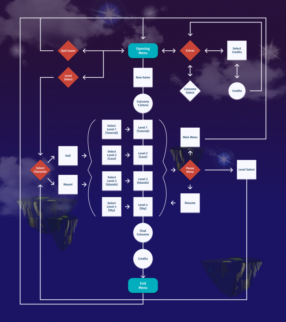 Our biggest priority as a team was creating an asset that could support our game developers working within the Unity game engine to piece Huli together. We decided that a game-flow, similar to a user flow, would be ideal as it would allow developers to refer back to a guide on where major sections of the game would occur, the arrangement of UI elements and how the user could move back and forth between them.