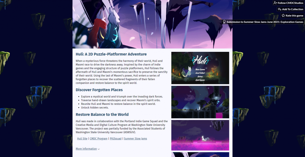 Huli is a 2D Puzzle-Platformer Adventure game for PC Desktop made in collaboration with the Portland Indie Game Squad (PIGSquad) and the Creative Media and Digital Culture Programs (CMDC Program) at Washington State University Vancouver. The project was partially funded by the Associated Students of Washington State University and took place during the Summer Slow Jams hosted by the PIGSquad in June of 2021.